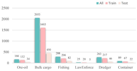 The ships in SRSDD are annotated with rotated bounding boxes and categorized into six classes: oil tankers, bulk carriers, fishing boats, law enforcement vessels, dredgers, and container ships. Experts inspected the corresponding SAR images and optical images, providing rotated bounding boxes and class labels for each ship target. This ensures their authenticity and accuracy. Figure 2 displays the quantity for each class. From the graph, it can be observed that bulk carriers constitute the majority of the dataset, while law enforcement vessels make up almost one-tenth of the bulk carriers. The overall distribution of the training and testing datasets is consistent. Additionally, considering the issue of having more offshore scenes than nearshore scenes in existing SAR datasets, SRSDD places emphasis on selecting nearshore scenes during sampling. In SRSDD, nearshore scenes account for 63.1%, while offshore scenes make up 36.9%. To ensure the fairness of experimental results, our experiments follow the same protocol as in the literature [], which uses 532 images for training and 134 images for testing. In both the training and testing sets, the categories, widths, heights, and angle distributions of the ships are similar to ensure the effectiveness of the test results. The specific distribution of ship quantities can be seen in Figure 2.