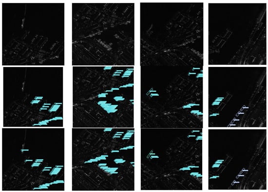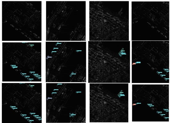 Figure 5 presents the detection and classification results for densely arranged ship scenarios. Typically, due to complex backgrounds, false alarms are a common occurrence in the detection results for onshore ships. Furthermore, the dense arrangement of nearshore ships poses a challenge to detection and classification. From the detection results, it is evident that our network accurately detects and classifies densely arranged ships in nearshore scenes while suppressing false alarms in these scenarios. This is attributed to our adoption of a rotation detection mechanism, which yields improved regression results for ship detection boxes in nearshore settings.