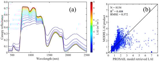 (a) PROSAIL simulated canopy reflectance varying with LAI. (b) Validation of PROSAIL model retrieved LAI from MODIS data against MCD15A3H product.