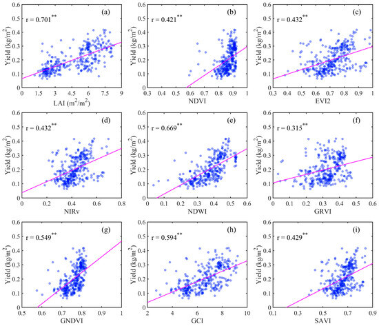 Scatterplots between alfalfa yield and (a) LAI and (b–i) VIs. Note that ** denotes the significant level of p-value < 0.001, and LAI was derived using Sentinel-2 data with the unified hybrid model.