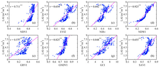 Scatterplots between LAI and VIs. (a) NDVI. (b) EVI2. (c) NIRv. (d) NDWI. (e) GRVI. (f) GNDVI. (g) GCI. (h) SAVI. Note that ** denotes the significant level of p-value < 0.001, and LAI was derived using Sentinel-2 data with the unified hybrid model.