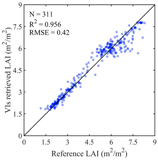 To begin, 94,500 sets of simulated canopy hyperspectral reflectance at 400–2500 nm were generated using the PROSAIL model. Figure 2 shows the typical canopy hyperspectral reflectance simulated by the PROSAIL model. It was observed that the simulated canopy spectra had typical vegetation optical characteristics. For instance, reflectance troughs occurred at both blue and red wavelength ranges due to photosynthesis, while reflectance peaks appeared at green, red edge, and near-infrared (NIR) domains. Specially, reflectance at red edge and NIR wavelength ranges obviously increased with increasing LAI (Figure 2). In general, higher LAI (i.e., more leaves) would generate enhanced multiple reflections within the vegetation and thus increase the canopy reflectance, forming the physical basics of remote estimation of LAI. LAI retrieval hybrid models using MODIS or Sentinel-2 data were developed through integrating the PROSAIL simulation dataset, the SRF of specific satellites, and an RF model. Due to the unavailability of in situ measured LAI data, the existing MODIS LAI product with reasonable performance was utilized to evaluate the accuracy of the unified hybrid LAI retrieval scheme. It is an acceptable strategy to evaluate the accuracy of parameter retrievals using the existing satellite product [50]. Figure 2b presents LAI retrieval validation results (RMSE = 0.572 m2/m2) from MODIS data with the hybrid model. Results indicate that the hybrid model guided by the PROSAIL radiative transfer model had reasonable accuracy in estimating LAI.