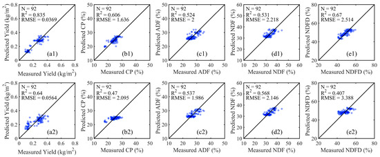 Scatterplots of measured and predicted alfalfa (a) yield, (b) CP, (c) ADF, (d) NDF, and (e) NDFD using (1) optical- and (2) SAR-based models.