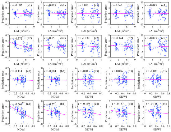 Crop greenness and water stress provide important information to characterize crop growth [58], and can be expressed by LAI and NDWI, respectively. The scatterplots between LAI/NDWI and alfalfa yield, CP, ADF, NDF, and NDFD prediction error from optical- and SAR-based models are shown in Figure 7. For the optical-based model, results denote that all scatter points were randomly distributed around line y = 0. The correlation coefficient r between LAI/NDWI and prediction error of all five alfalfa parameters were insignificant and small, with a range of −0.114–0.045 (p-value > 0.01). These results demonstrate that the proposed optical-based model had sufficiently explained the relationship between all five alfalfa parameters and LAI greenness and water stress. For the SAR-based model, the correlation coefficient r between LAI/NDWI and prediction error of ADF, NDF, and NDFD were insignificant, ranging from −0.187 to −0.073 (p-value > 0.01). However, yield prediction error significantly correlated with LAI (r = −0.572, p-value < 0.001) and NDWI (r = −0.568, p-value < 0.001), and CP prediction error had a weak correlation with NDWI (r = −0.27, p-value < 0.01). These results indicate that the SAR-based model had not fully explained the relationship between alfalfa yield/CP and greenness and water stress. This is the main reason that the optical-based model performed better than the SAR-based model in predicting alfalfa yield and CP. Compared to yield, quality traits had smaller correlation coefficients with LAI and NDWI (Table 3). As a result, LAI/NDWI had insignificant correlation with the prediction error of alfalfa quality traits from the SAR-based model (Figure 7(b2–e2) and Figure 7(c4–e4)).