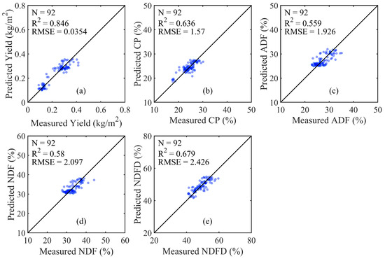 Scatterplots between measured and predicted alfalfa (a) yield and (b–e) quality traits using integrated optical and SAR data with a multiple linear approach.