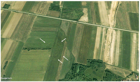Subsequent images do not reveal the details as the 2007 one does, but the area of the circular enclosure is clearly visible as a soil mark on later Google Earth images and also orthophotos from the Croatian State Geodetic Administration (DGU from here on in the text), for instance, the one from 2014 and those on drone images (Figure 3). In oblique images taken from an airplane on 10 June 2015, the crop marks are not clearly visible [16].
