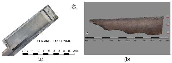 Archaeological excavations on the site of Gorjani Topole have been carried out twice so far, in March 2020 and 2021. The 2020 research was planned to confirm the presence of the ditches, which were observed on satellite and aerial images and also confirmed through magnetic surveys (Figure 2, Figure 3 and Figure 4). A trench was chosen with the intention of excavating the remains of circular ditches and a palisade visible on magnetograms and aerial images. During March 2021, archaeological excavations were carried out at the site of one of the houses that was recorded on magnetograms. Due to the feasibility of the research, one of the smaller houses was chosen.
