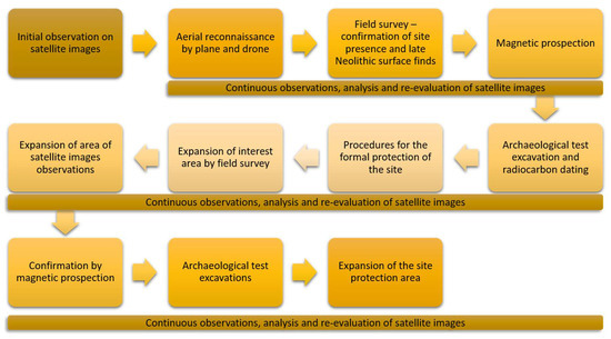 With this approach, we established a workflow (Figure 11) that consists of the initial observation of satellite images, followed by monitoring through aerial images from drones and airplanes, before confirmation through field inspection and magnetic surveys, which so far have shown us that it is necessary to expand the area of observation of satellite images and we found that these sites almost always expand and that their area is much larger. These additional observations were confirmed through further field surveys, excavations and magnetic surveys, followed by new observations, additional expansions and, ultimately, the expansion of the formal official protected zone. The detailed and repeated analysis of satellite images provides us with a deep insight and, so far, no sufficiently explored possibilities of soil and crop marks. Marks manifested as dark spots are confirmed at the site of Topole as large pits (Figure 4). This can also strengthen our interpretation of pits on other still unpublished sites.