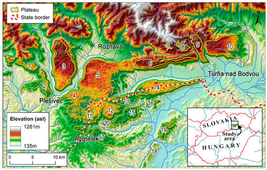 Map of the study area. Karst plateaus are marked by ID numbers: Jelšavská (1); Koniarska (2); Plešivská (3); Bučina (4); Silická (5); Horný (6); Žl’ab (7); Bôrčianska (8); Zádielska (9); Jasovská (10); Kečovská-Haragistya (11); Nagyoldal (12); W-Alsó-hegy (13); E-Alsó-hegy (14); Szinpetri (15); Páska-bükk (16); Aggtelek (17); Rudabánya (18); Szalonna (19); Jósvafő (20).