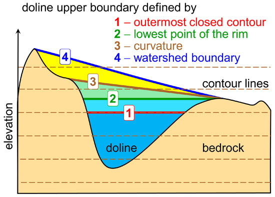 Even if it is already decided which feature is considered to be a doline, there is still the question of where exactly to draw the outline of the feature. The outline of the doline can be determined by several methods (Figure 2). On topographic maps, the doline is indicated by closed contour lines (or occasionally by symbols). Thus, the edge of the doline can be defined most simply by the outermost closed contour (OCC). This is slightly lower compared to the lowermost point of the doline’s real rim. In fact, the vertical deviation is smaller than the value of the contour interval. Therefore, it necessarily represents a slightly narrower delineation than reality. At the same time, this instruction is clear and easy to follow for the digitizer, so this method is used quite often, especially if the basic data are topographic maps [7,21,26,31,98]. Another clear definition for doline delineation is the imaginary closed contour at the level of the lowermost point of the doline rim. This definition has become widespread in the case of DTM-based delineations [11,12,13,14,15,16,18]. Nonetheless, there is also an approach that states that the outline of the sinkhole is not necessarily horizontal. According to this definition, the outline of the sinkhole must be adjusted to the abrupt change in slope (that is, to the profile curvature maximum). However, the slopes of the doline edges can be so varied, and the slope transition often so gradual, that it is not possible to build a clear and universal definition based on this principle. As a result, this type of approach generally requires manual delineation, which leads to subjectivity. Thus, this method has not become widespread, although some researchers favor this definition despite its practical difficulties [20,98,99]. Finally, the outline of the doline can also be defined as the watershed belonging to its deepest point. This can unequivocally be performed on the basis of DTMs, but this method usually leads to much larger features than the real forms of dolines, except in the case of polygonal karsts consisting of closely packed dolines [10,16].