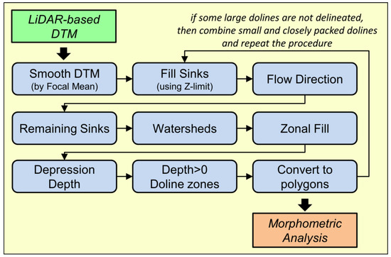 Geomorphology deals with the study of landforms, and its purpose is not merely to provide descriptions but also to draw conclusions about the development of landforms. Within this field, geomorphometry deals with the measurable parameters of landforms and examines their statistical and spatial distributions and the relationships between the parameters. The availability of LiDAR-based digital terrain models (DTMs) represents a leap forward in the examination of smaller landforms. The dolines (or sinkholes) of karst terrains are just such small forms, the diameter of which varies between 1 m and several 100 m [1,2], so LiDAR can provide the optimal raw data for their investigation. Nevertheless, doline morphometry was already “investigated” well before the advent of LiDAR datasets. The first doline morphometry papers appeared in the 1970s [3,4]. GIS greatly improved the possibilities of doline morphometric analyses, thanks to which it became possible to examine increasingly larger databases (containing several tens of thousands of dolines). As a result, the number of articles dealing with doline morphometry has gradually increased since the 2000s [5,6,7,8,9,10]. Even in this period, however, the morphometric characterization of sinkholes was mainly based on topographic maps, aerial photographs, and field surveys. The scale and quality of these datasets varied greatly from country to country. However, the growing availability of LiDAR data made it possible to delineate the precise shape of dolines on the basis of high-resolution (i.e., 1–2 m cell size) DTMs [11,12,13,14,15,16,17,18,19,20,21,22]. We note that, in recent years, sinkholes delineated using the SfM (Structure from Motion) method for aerial photos taken from drones have increasingly been included in the analyses [23,24,25,26], but this type of data acquisition has specific issues (e.g., influence of vegetation); therefore, this procedure is not dealt with in this article.