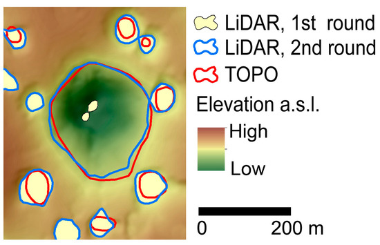 Finally, regarding circularity (Figure 6), the diagram demonstrates that the shapes of TOPO dolines are more circular (for the whole study area, the median circularity of dolines is, on average, 3% smaller for the LiDAR than for the TOPO dataset; for Hungary, this value is 4%, and for Slovakia, 2%). The reason for this is that, according to cartographic principles, a kind of “generalizing/rounding effect” already prevails during the drawing of the contour lines in the map. In addition, during the digitization of the dolines, a further smoothing effect may have played a role. In contrast, during the LiDAR-based derivation, dolines are delineated by more realistic contours that better match the actual (observed) shapes of the dolines.
