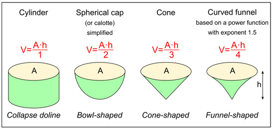 In this paper, a new morphometric parameter is also introduced: the 3D-shape parameter (k). The purpose is to characterize the ideal 3D geometric shape of dolines. In the literature, the shape of dolines is approximated as a cylinder, a bowl (or calotte), a cone, or a funnel (Figure 5). Naturally, these are idealized shapes, but they are often linked to genetic types. Namely, collapse sinkholes can be approximated by a cylinder, whereas solution dolines are closer to bowl or cone shapes. Before the advent of DTMs, the researchers selected a 3D shape typical of dolines in their research area, and the volume was calculated from the area and depth using the formula linked to the selected shape. Now, the situation is just the opposite: we are able to precisely calculate the volume using the LiDAR-based DTM, and we can assign an “idealized 3D shape” to the doline based on its volume. In order to carry this out, we have to take into account how the volume formulae change for the ideal 3D shapes. It is observed that the volume formulae have similar structures, and they can all be written in a general form: