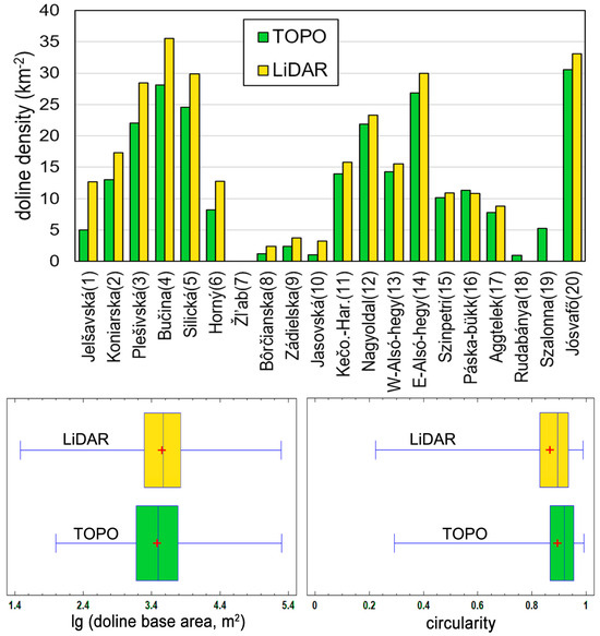 A comparison of topographic map-based (TOPO) and LiDAR-based parameters. In the case of two plateaus (Rudabánya Mountains (18), Szalonna Karst (19)), no LiDAR data were available. Top: doline density; bottom left: box-whisker plot of doline area logarithms; bottom right: box-whisker plot of doline circularity. The vertical line in the box indicates the median, whereas red + indicates the mean values in the box-whisker plots.