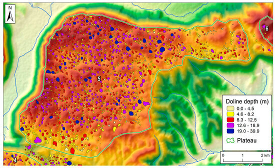 Dolines of Silická plateau (5) delineated by the LiDAR-based methodology. Doline colors are according to depth. The numbers 4–6 refer to plateaus as in Figure 1 and Table 1. The map containing the whole Aggtelek Karst and Slovak Karst can be downloaded as a Supplementary File (Figure S1).