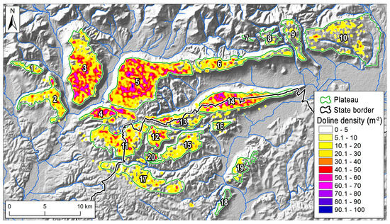 Table 1 demonstrates that there are significant differences in both the number and the density of dolines among the individual plateaus. There are no dolines at all on Žl’ab Mt. (7), and there are only a few dolines in the Rudabánya Mountains (18); thus, these are not doline-dotted plateaus. A rather low doline density (<8.8 km−2) characterizes Borčianska (8), Jasovská (10), Zádielska (9), Szalonna (19), and Aggtelek (17) karst plateaus. A moderate doline density (10.8–30 km−2) is typical of most plateaus, while the locally highest values (>28 km−2), though still only “medium” according to the general classification [32], are found on Plešivská (3), Silická (5), E-Alsó-hegy (14), Jósvafő (20), and Bučina (4) plateaus.