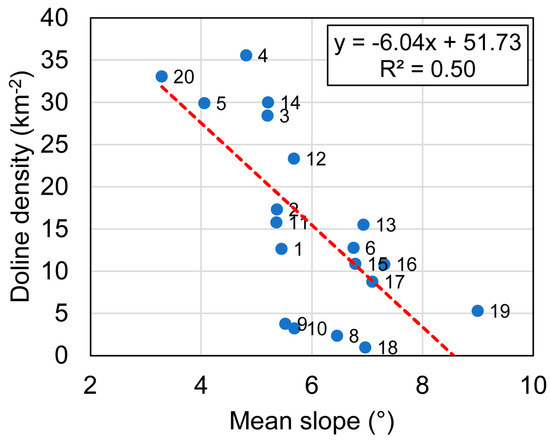 The spatial distribution of dolines can be well illustrated with a doline density map (Figure 8). This map shows that the north–central parts of the karst area are the most densely scattered with dolines. However, exceptions to this simple observation also exist; for example, Alsó-hegy (13, 14), Jósvafő plateau (20), and the northern tip of the Koniarska plateau (2) also have high-doline-density parts. In addition, a high-doline-density zone can be observed along the Gombasek–Silica tectonic line (between Silická (5) and Bučina (4) plateaus), which also continues to the NW on the Plešivská plateau (3). Regression analysis supports that the doline density is also influenced by the slope angle. At the level of plateau mean values, it is observed that there is a moderate (R2 = 0.50) negative correlation between the doline density and the mean slope angle (Figure 9). This means that, trend-wise, on the plateaus that are more horizontal, dolines are found in higher densities.