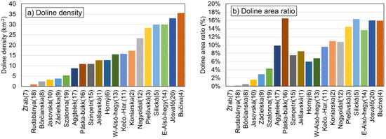 Doline density (a) and doline area ratio (b) by plateau sorted by doline density.