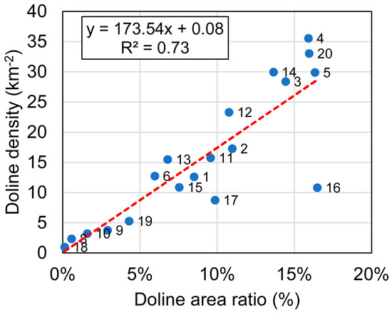 An indicator similar to the doline density is the doline area ratio, which expresses the proportion of the surface that is covered by dolines. The difference with respect to the doline density is that larger dolines may create greater coverage, even at a lower doline density. According to Figure 10, a high area ratio due to large dolines is the most characteristic of the southern and western parts of the karst region, as the most obvious outliers are the Aggtelek (17) and Páska-bükk (16) plateaus, but the Szinpetri (15), Jelšavská (1), and Koniarska (2) plateaus also advance in the doline area ratio ranking with respect to the doline density rank. A possible explanation for this fact is that the development of the dolines along the boundaries of the karst areas was more intensive due to streams flowing from non-karst areas to the karst terrain; thus, the dolines could grow larger in these parts. In the case of Páska-bükk (16), there is a special reason: one of the largest dolines in the entire karst region is found here (A = 125,784 m2), which results in an outstanding “doline area ratio”. The difference between the interpretation of the doline density and the doline area ratio is also reflected in Figure 11. In the case of similar-sized dolines, the relationship between the doline density and the doline area ratio would be a simple line with R2 close to 1. However, as Figure 11 demonstrates, the strength of the relationship is strong but not very strong. Points above the regression line mean plateaus where the doline density is higher than expected from the doline area ratio due to the high proportion of relatively small dolines. On the other hand, points below the line mark plateaus, where relatively large dolines significantly increase the doline area ratio, even if the doline density is not so high. The most extreme example is the Páska-bükk (16) plateau due to the aforementioned reason.