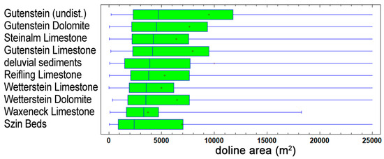 Box-whisker plots of the doline area categorized by bedrock. A vertical line indicates the median value, and “+” is the mean value.