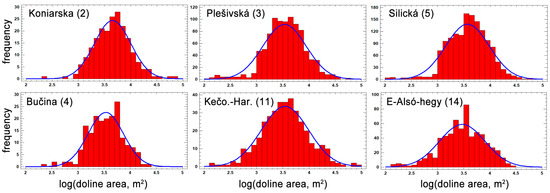 Regarding the study area, the results support that the statistical distribution of doline areas can be well modeled by the lognormal distribution. Table 4 indicates that, for most plateaus, the statistical tests (chi-square and Kolmogorov–Smirnov) confirmed that the logarithm of the data shows a normal distribution; therefore, the distribution of the original data is lognormal. For the sake of brevity, only the six plateaus with the most sinkholes are shown in the diagrams (Figure 13). As for Plešivská (3), Silická (5), and E-Alsó-hegy (14), if the smallest features detected as dolines are omitted using 200 m2 (equivalent diameter ca. 8 m) as a lower limit for the doline area, then the statistical tests support the lognormal distribution even in these cases. This means that only a few small features (n = 17, 20, and 12 for Plešivská (3), Silická (5), and E-Alsó-hegy (14), respectively) obscure the lognormal nature of the distributions for these plateaus.