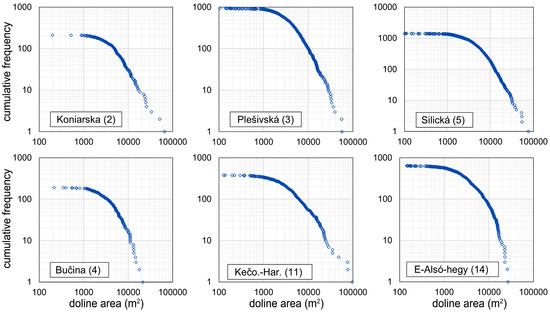 The possibility of a power-law distribution was also examined. Graphs showing the cumulative frequency distribution for the six plateaus with the most sinkholes were also created (Figure 14). If a logarithmic scale is used on both axes and the power-law distribution is true, then the points must fit on a straight line [17,39]. The results indicate that only a limited part of the graphs fulfills linearity; i.e., the power function fits only a limited part of the original data. The lower limit of linearity cannot be clearly determined based on these graphs, because the slopes of the functions change gradually, but as an approximation, one can say that the graph is linear for doline areas above 5000 m2. This value is much higher than the threshold used during the doline delimitation procedure; thus, it is not an artifact. Therefore, it is stated that the power-law distribution is not suitable to model doline area distributions in this karst terrain.