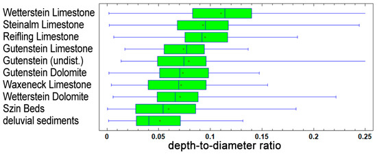 A box-whisker plot of the doline depth-to-diameter ratio according to lithological categories. A vertical line indicates the median value, and “+” is the mean value.
