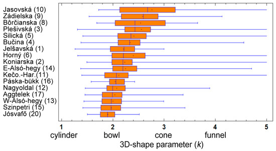 In this formula, k reflects the ideal 3D shape of the given feature. Naturally, it is possible that a doline has exactly the same volume as the same-area and same-depth cone, while its true shape is quite different. Thus, we cannot say that if k is exactly 3, then the doline has a perfect cone shape. That is why we speak about an “idealized 3D shape”.