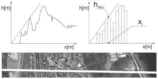 Example determination of : bottom—white line is vision for a given ; top left—continuous height profile, top right—discrete height profile; where: —distance from point , —height of an object.