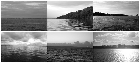 To validate the methodology proposed in this paper, the authors conducted testing using real-world image data. The research began with the assembly of an image database. In order to compute the map representation, , a prerequisite is the use of a neural network capable of delineating the location of land within an image through semantic segmentation. To facilitate this, a corpus of 3000 images was collected, covering a range of weather and lighting conditions, as shown in Figure 8. These images were captured in various locations, including different areas of the Baltic Sea and inland waters, to ensure a diverse and representative dataset for robust testing.