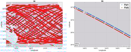 Comparison of FM1 and FM5 observations for 11 SEP 2019. (a) Rendering of the ground samples captured during the 24 h period in the near-overlap condition; (b) A single track of samples for both FM1 and FM5 that has been matched sample-for-sample to facilitate one-to-one comparisons of the observations. The samples from each observatory are no more than 0.5 deg apart in distance and were acquired approximately 3 s apart in time.