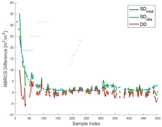 A display of model (blue) and observed (green) single-differenced matchup data for a single CYGNSS track, with the double-differenced data (red) overlaid. Note that both the model and observed single differences are similarly high early in the track, suggesting that the differences in the observations may be because the samples are observing fundamentally different targets, captured in . The double-difference accounts for these types of errors, and for the entire track, the double-difference is quite stable. The sparsity of data is caused by quality control parameters, such as when the CYGNSS observatory is performing its onboard calibration procedure, which occurs once every minute. Because the two matched observatories do not have synchronized calibration clocks, the matched dataset typically flags out two of these cadences for every minute of sampling.
