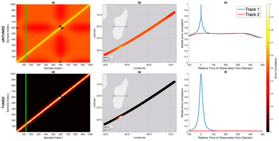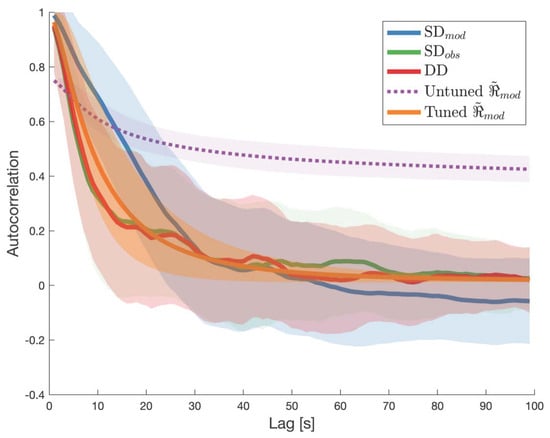 where is calculated using Equation (7), is the lag, and is the total number of lags observed. The quantity is reasonably comparable to the autocorrelation of observed error for a single track of samples. A similar analog can be made for the bulk modeled error autocorrelation , which estimates the autocorrelation behavior of the error model across M tracks: