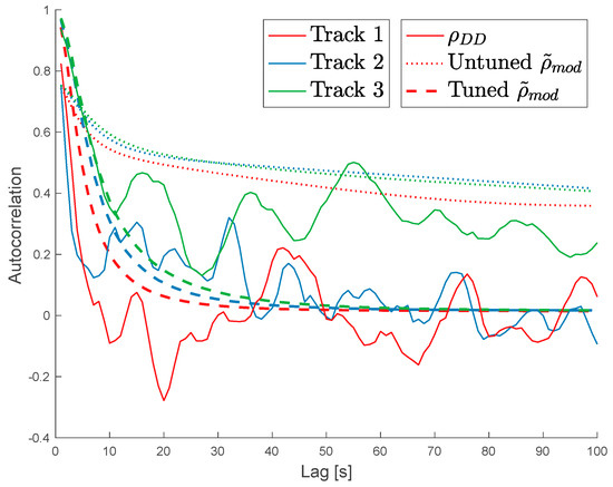 The tuned model can be compared to single-track autocorrelations of matched-sample double-differences using the modeled error autocorrelation as described in Equation (12). We compare three exemplar tracks in Figure 4.