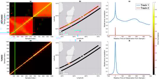 The tuning parameter is used to vary the relative magnitude of the near-sample correlated error roll-off. In our tuned model, this parameter remains at 1. The tuning parameter is used to enhance or reduce the steepness of the roll-off in correlation caused by two observations moving farther apart in the nadir and zenith coordinate systems. If , it enhances the steepness of decay. The fact that our optimized tuning maintains suggests that the filtering theory discussed in Lemma A1 is a reasonable model of decay.