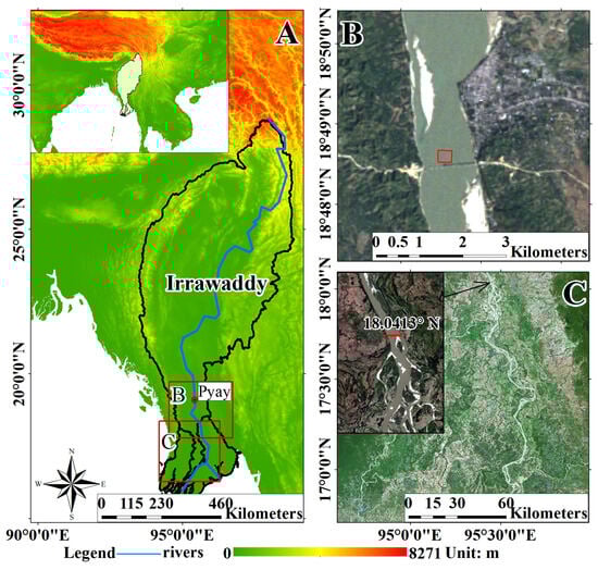 (A) The location of the Irrawaddy River (blue line) and the basin (black line). (B) The location of the satellite image of the selected inversion modeling area (red box). (C) The location of the satellite image used to estimate the FTSM (red line).