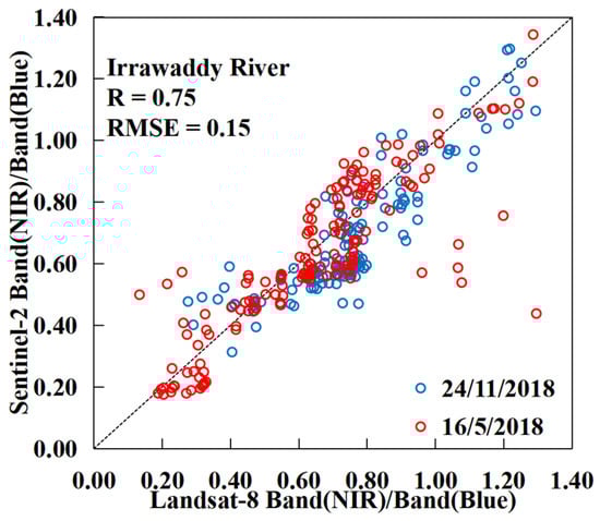 Since the main wavebands of the TSM inversion are near-infrared and blue light and the inversion model is based on the ratio of near-infrared to blue light wavebands, in each group of comparison images, we first resample the Sentinel image to the same resolution as the Landsat image. Then, we randomly take points in the river area, calculate the ratio of its near-infrared to its blue light wavebands, and compare the results of the two images. As shown in Figure 2, the results reveal that in the Irrawaddy River, the overall R = 0.75, and the root-mean-square error (RMSE) = 0.15. Our data are more accurate and reliable following FLAASH atmospheric correction and can therefore be used for FTSM estimation.