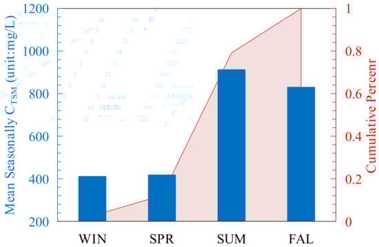 Seasonal average CTSM trends in the Irrawaddy River calculated based on empirical data from the literature. The blue histogram shows the specific values of the seasonal average CTSM, and the red stacking curve shows the cumulative percentage of CTSM by season.