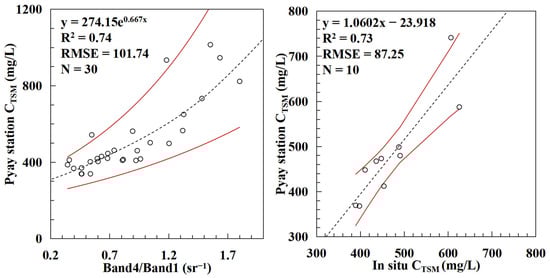 According to the discharge and FTSM data provided by Furuichi from the Pyay station, we divided the FTSM by the river discharge to obtain the CTSM. We calculated the seasonal average reflectivity in a 10 × 10 pixel area on the section near Pyay (Figure 1B) using Landsat 5 TM images from 1990 to 1996 and compared it with the measured data to construct an inversion model for the CTSM in the Irrawaddy River. The ratio of near-infrared to blue light has a good correlation with the CTSM using the following expressions: