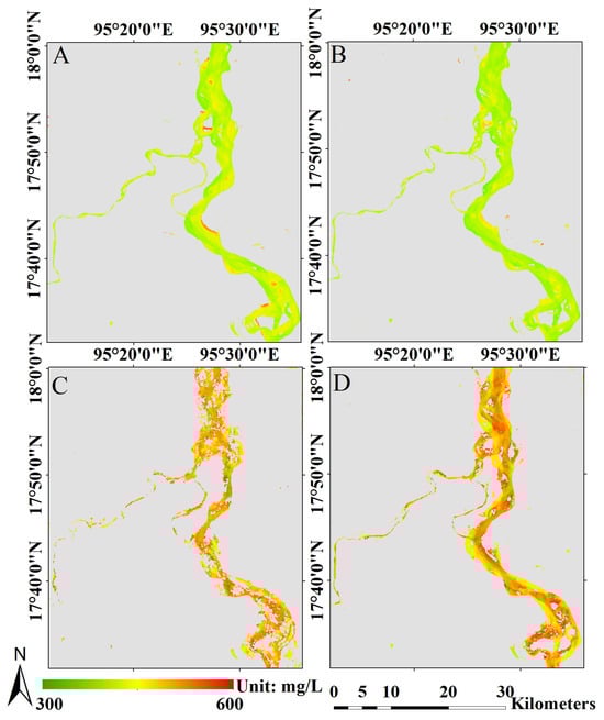 Distribution trends in the Irrawaddy River CTSM in (A) winter, (B) spring, (C) summer, and (D) autumn.