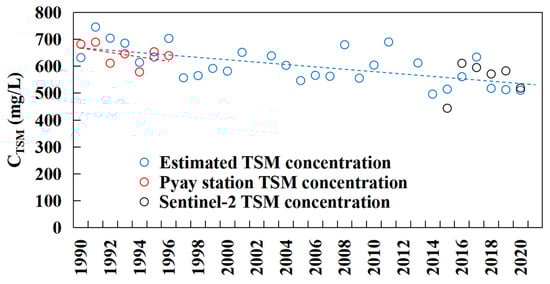 After filling in the missing data with the measured data from the Pyay station from 1966 to 1996, we obtained the quarterly average CTSM dataset for the Irrawaddy River in the most recent 30 years. Based on this dataset, we calculated the annual average CTSM for each year, and the results are shown in Figure 7. Sentinel-2 satellite, with higher spatial and temporal resolution compared to Landsat, was utilized in our study with data spanning from 2015 to 2020. After numerical transformations (Table 1), we performed calculations for the CTSM using the same methodology. Despite discrepancies in the results due to differences in sensors, the inversion outcomes from both satellites exhibit consistent temporal trends over the studied period. Moreover, we also synchronously displayed the calculated results based on the measured dataset for the Pyay station. The results show that the inversion results of the satellite images are similar to the calculated results of the measured data in terms of their trend change and absolute values. The results showed that during the 1990–2020 period, the CTSM of the Irrawaddy River showed a downward trend.