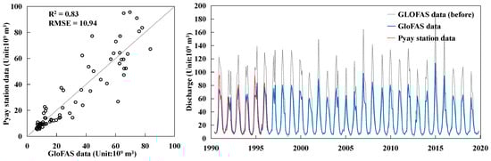 The correction results (left) of and the corrected discharge changes (right) in the GloFAS discharge data based on the measured discharge data of the Pyay hydrologic station. The red dotted line is the discharge data measured from Pyay, the blue solid line is the corrected discharge data from the GloFAS, and the gray dotted line is the uncorrected discharge data from the GloFAS.