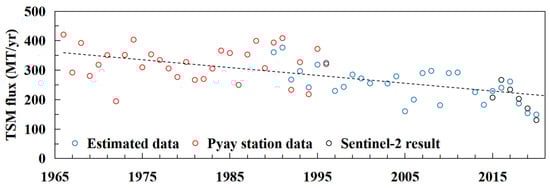 Annual FTSM changes in the Irrawaddy River. The red circles refer to the measured FTSM data for Pyay station, the blue circles refer to the inverted FTSM data based on Landsat data, and the black circles refer to the inverted FTSM data based on Sentinel-2 data. The black dotted line is the linear fit of the change in the Irrawaddy River from 1966 to 2020.