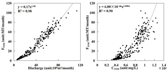 The change in the FTSM depends on the change in river discharge and CTSM. We analyzed the correlation between the FTSM of the Irrawaddy River and its CTSM and discharge (Figure 10). The results show that in the Irrawaddy River, the FTSM is strongly and exponentially correlated with the CTSM and discharge, and both R2 values are greater than 0.9, which indicates that the contributions of the CTSM and discharge to the change in the FTSM in the Irrawaddy River are equivalent. Discharge had a greater correlation with the FTSM.