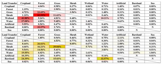 The results of land transfer in the middle and upper reaches of the Irrawaddy River basin (red) and the lower reaches of the delta (yellow) represent the percentage of land area transferred from column elements to row elements; N represents no element transfer.