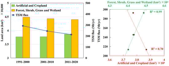 Figure 12 shows the land classification results for the Irrawaddy River basin in 2000 and 2020. The land around the Irrawaddy River is mainly cropland. Agricultural activities and mining play key roles in the stability of riverine soils. Figure 13 shows that, except for the mutual conversion between vegetation types, most of the vegetation has been transferred to cropland, which is consistent with the conditions in Myanmar, a large agricultural country. A study noted that the distribution of mangroves in the Irrawaddy Delta decreased from 1978 to 2011, mainly due to the expansion of agriculture in this important economic region []. According to the land classification results, in the downstream Irrawaddy Delta (i.e., 15°N–20°N), the forest area decreased by approximately 144 km2, and the grassland and shrub land decreased by approximately 829 km2. The expansion of cultivated agricultural land in the lower reaches and the reduction in vegetation area may lead to a reduction in land stability in the Irrawaddy River Delta, which is not conducive to deltaic deposition, especially in the context of its sustained reduction in FTSM. In the upper reaches of the Irrawaddy Delta (i.e., 20°N–25°N), the total area of all types of vegetation increased by 1159 km2. The results in Figure 12 show that the vegetation coverage in the upper reaches of the delta has increased, some barelands and croplands have been converted to forests, and the artificial land area has increased. The region is attempting to restore its overall level of vegetation, and an increase in vegetation also increases the soil conservation capacity, which, in turn, reduces the contribution of land-based sediment yield to TSM; additionally, this may be one of the reasons for the reduction in downstream FTSM. Moreover, the agricultural center of gravity in the Irrawaddy River basin tends to shift to the lower reaches. Figure 14 describes the trend change in land types dominated by human activity and vegetation in the Irrawaddy Delta during 1991–2000, 2001–2010, and 2011–2020, as well as their correlations with the FTSM in the same period. The extent of human activity in the Irrawaddy Delta has gradually expanded over the last 30 years, and changes in the level of vegetation (R2 = 0.99) have a greater impact on the FTSM than human activity (R2 = 0.70). In general, the increase in vegetation in the upper reaches of the Irrawaddy Delta has enhanced the land conservation capacity of the region and reduced the sediment yield of terrestrial suspended solids, thus reducing the CTSM in the river.