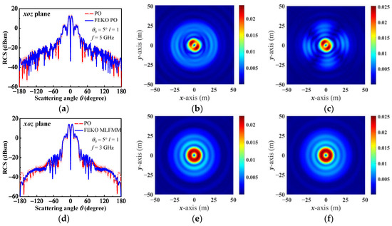 Based on a radio attenuation measurement flight experiment reported by the National Aeronautics and Space Administration, an aircraft with a length of 1.3 m was selected as the target model for the research [45]. To illustrate the validity of the proposed algorithm, a validation example was used to compare the calculation results of the PO method with those of FEKO 2021 EM simulation software. The RCS (far field) and scattering field distributions of a perfect electric conductor (PEC) blunt cone and a PEC blunt cone coated with a single-layer dielectric were calculated using the PO method and FEKO; the results are presented in Figure 5. The receiving plane of the scattering field was located at z = 60 m, and the coating dielectric parameter was set to εr = 0.3 + 0.7i (coating thickness: 0.1 m). The dielectric parameters and coating thickness of the target were obtained according to NASA flight tests. The thickness of the plasma sheath during aircraft flight is about 0.1 m. Based on the plasma parameter measured during flight, the dielectric parameter of the coating was further calculated using the Drude model [45,46]. There is no ideal vortex beam excitation in FEKO 2021 simulation software. We imported the vortex beam EM field data into simulation software, and the near-field aperture field was used to equivalent the incident vortex beam. However, it is worth noting that this equivalent method will bring some errors. Therefore, in comparing the results calculated by the PO algorithm and FEKO, there is a slight difference in the scattering field intensity distribution in the peripheral region.