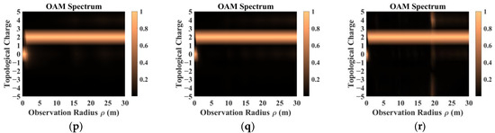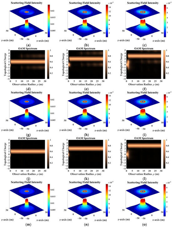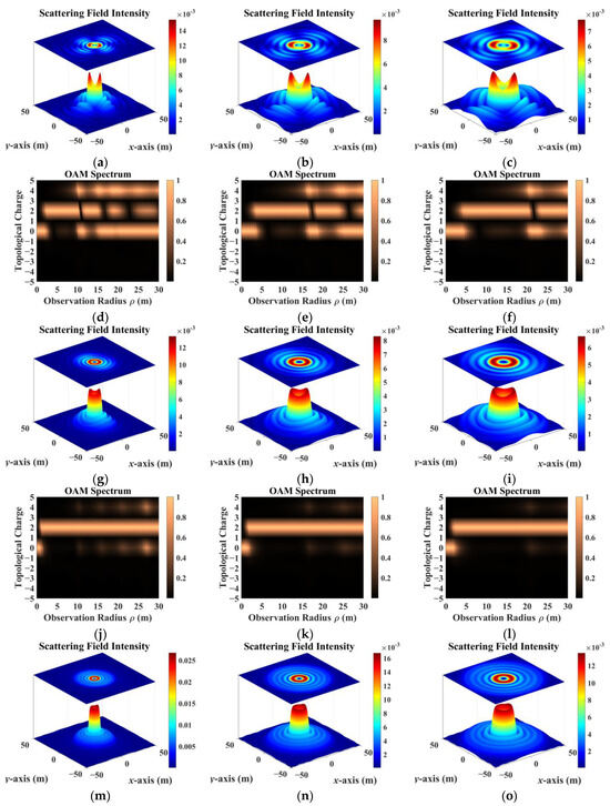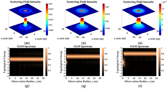 Scattering field intensity and scattering OAM spectral distributions of metal, dielectric, and coating targets at different receiving-plane distances. Panels (a–c,g–i,m–o) correspond to the scattering electric field intensity distributions, and panels (d–f,j–l,p–r) correspond to the scattering OAM spectra. The outcomes are the same as those in Figure 8, but the first three columns correspond to receiving-plane and target distances of 50 m, 80 m, and 100 m, respectively.