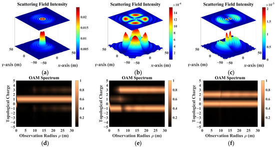 As is commonly known, the impact of frequency on a beam is multifaceted, leading to variations in intensity distribution, hollow-region size, and other parameters. Based on this understanding, our study included an in-depth examination of the effects of incident frequency on target scattering and changes in the OAM spectrum. The results of this investigation are presented in Figure 13. Among them, the simulation parameters are the same as in Figure 12, except that the frequency f changes to 3 GHz, 5 GHz, and 10 GHz. The incident frequency not only affected the size of the scattering electric field but also changed the oscillation distribution of the scattering electric field. Figure 13 shows that as the frequency increased, the scattering electric field tended to contract, whereas the peak intensity also increased. Thus, when the frequency increased, the scattering energy distribution was more concentrated, which was consistent with the effect of the frequency increase on the incident field. Other modes may appear at smaller observation radii. The main mode had an absolute advantage in that it indicated the mode of the incident beam. The other modal values contributed less. The OAM spectrum of the coating targets was the least affected by frequency changes. In future research, we will use target scattering data to identify and invert beam and target parameters based on machine learning.