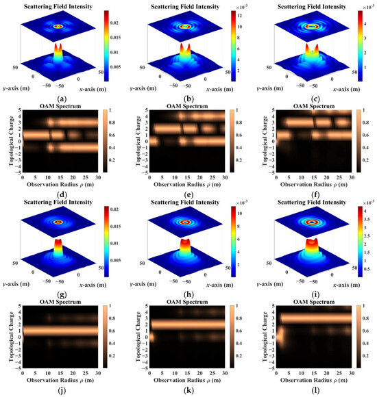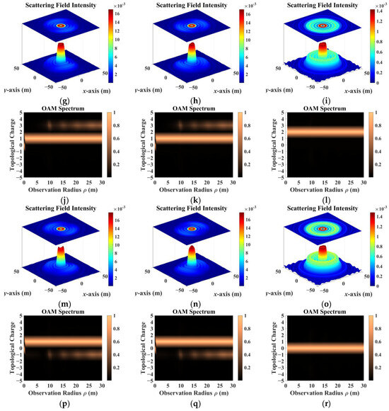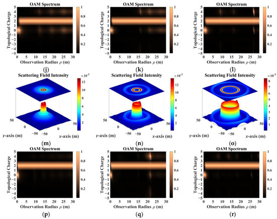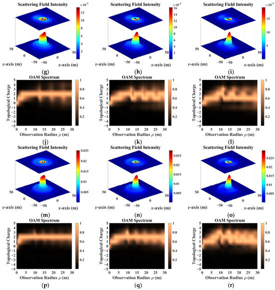 Scattering field intensity and scattering OAM spectral distributions of metal, dielectric, and coating targets under different half-cone angle incidence conditions. Panels (a–c,g–i,m–o) correspond to the scattering electric field intensity distributions, and panels (d–f,j–l,p–r) correspond to the scattering OAM spectra. The outcomes are the same as those in Figure 8, but the first three columns correspond to half-cone angles of 2.8°, 10°, and 20°, respectively.